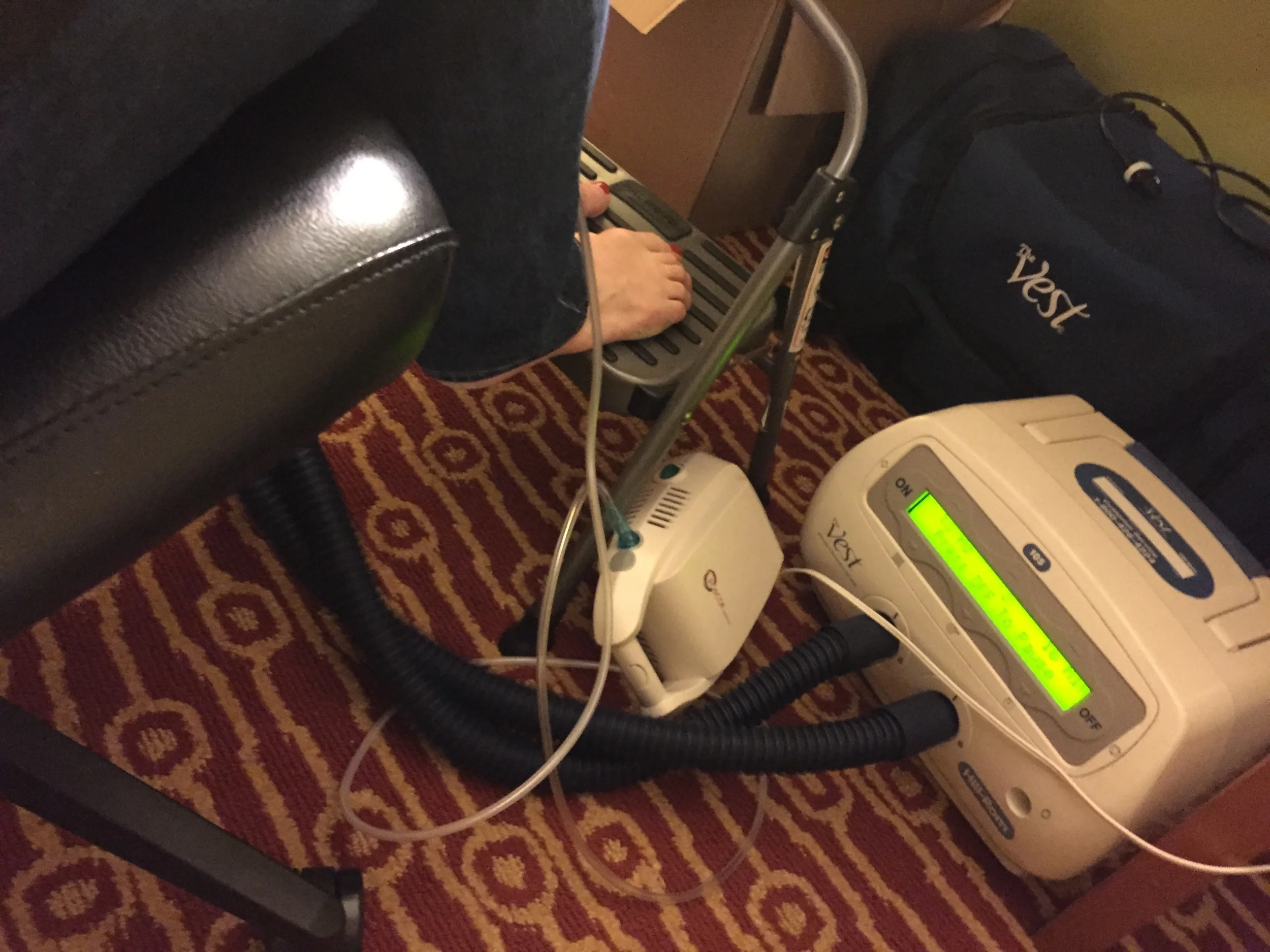 Someone was smoking in our non-smoking hotel. (Don't do that. It ruins other guests' day.) The smoke and odor came into our room through the vent in the bathroom. Cigarette smoke and odor is horrible for a trach kiddo. (Well, just about everyone, right?) The hotel's solution was to spray strong fragrance to cover the smell. Strong fragrance is horrible for a trach kiddo, too. If this ever happens to you at the same time that the Kroger convention is in town filling every other hotel room in the city, here's the solution: Shove a wash cloth in the vent and tape a plastic bag over the whole thing. Medical tape holds through hot showers by the way.