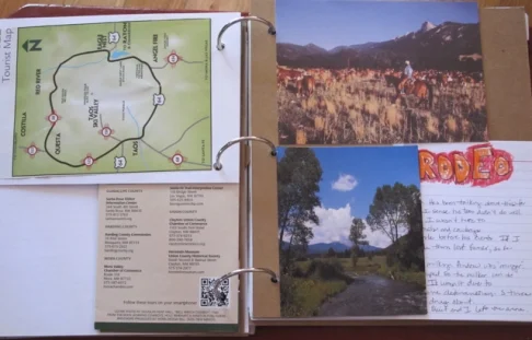 I used the free maps at the state visitor centers, attraction brochures, and post cards to add visual reminders of each day. The smaller tag board pieces were fantastic to adhere the postcards to.