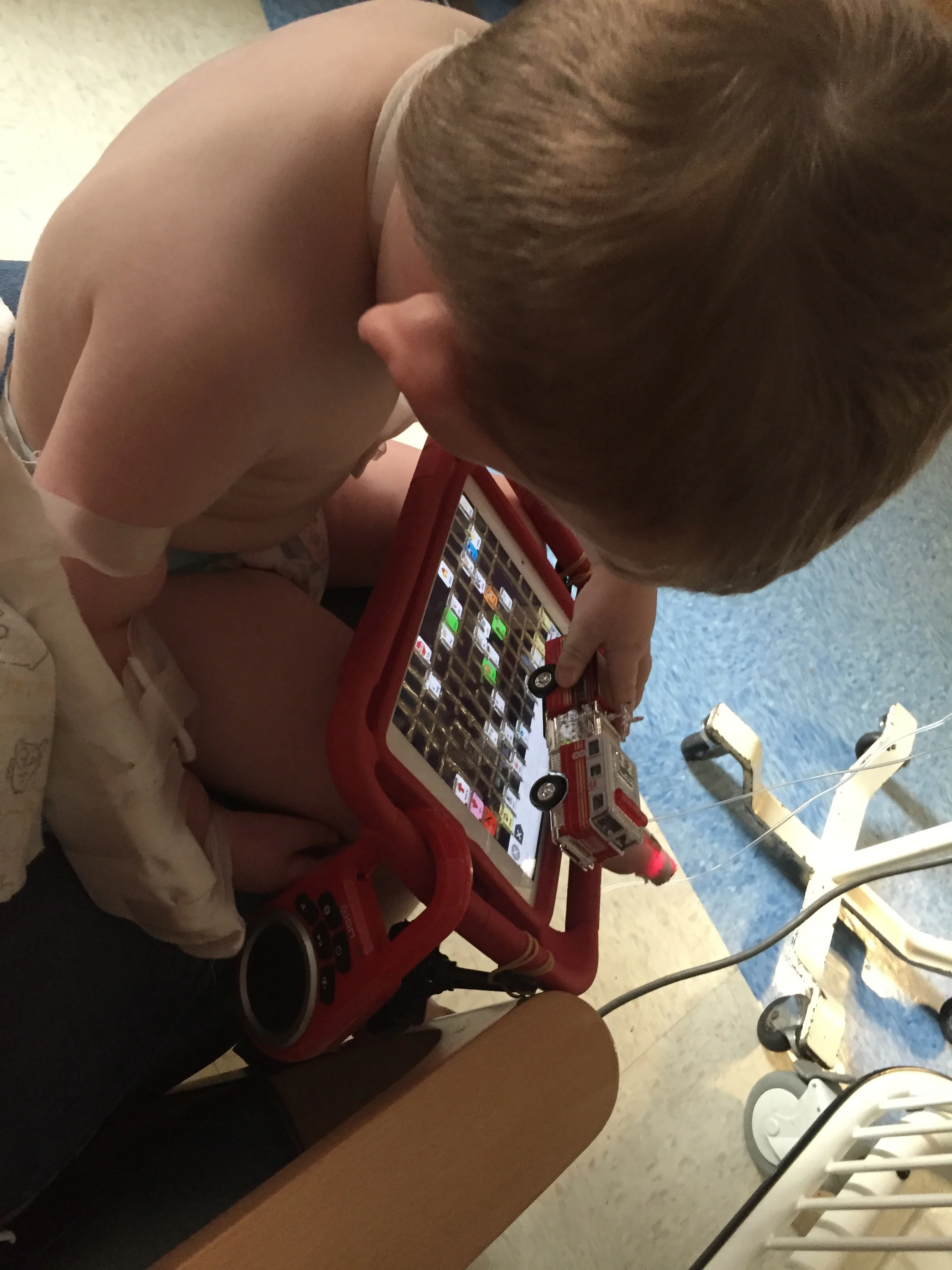 But Nathaniel's new fire truck has given us many opportunities to discuss moving things. Child Life saw his enjoyment with that vehicle and has given him a red race car. The time in the hospital has given us a lot of Mommy and me play time. (And lots of blurry selfies!) I love watching Nathaniel's expressive language grow. He has learned which home page icon to use to find vehicles. Yesterday he used TRUCK for the fire truck, but today he started to use FIRE TRUCK specifically. Categorizing and distinguishing between the two choices shows not only language ability, but also Nathaniel's age-appropriate cognitive abilities.