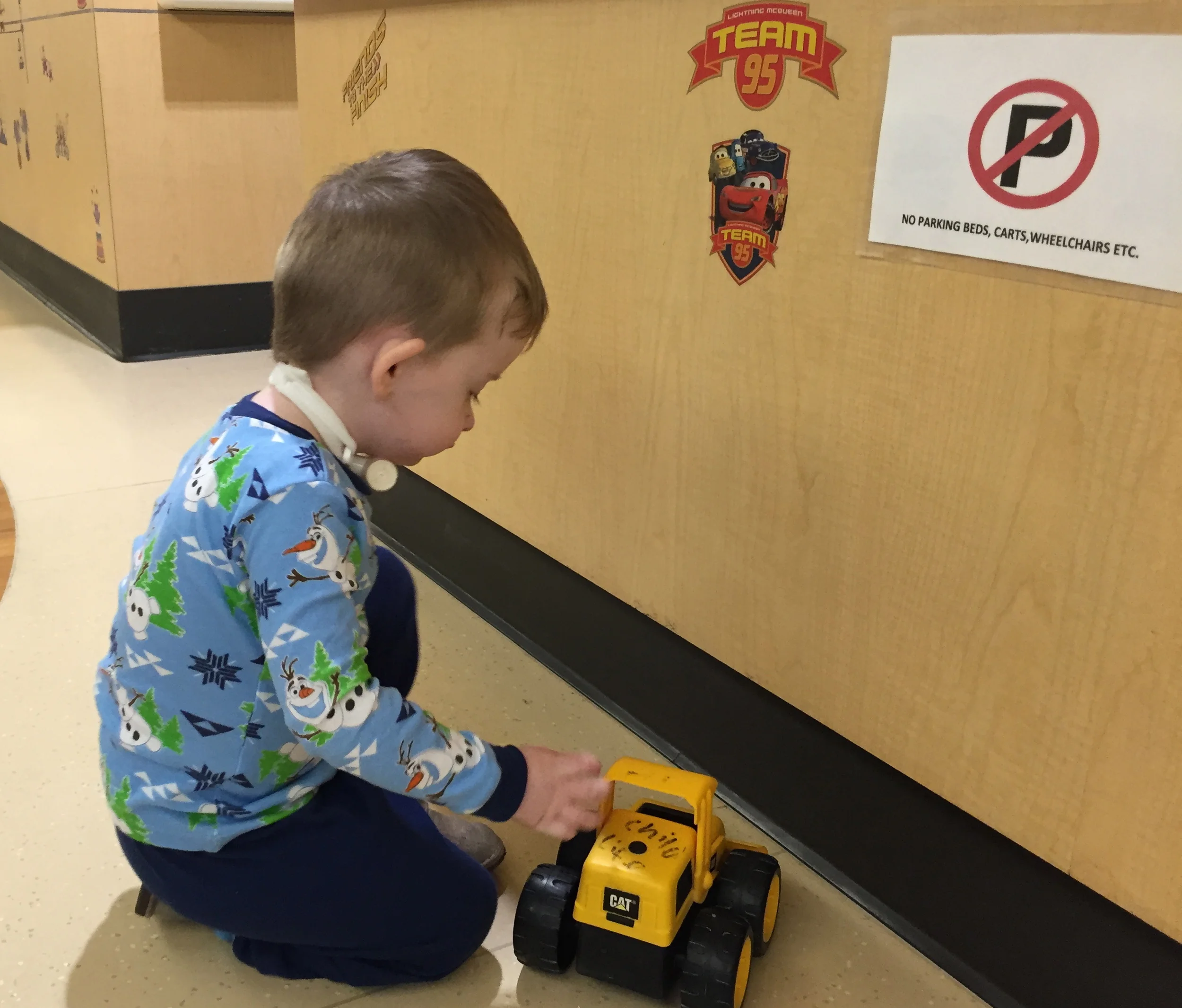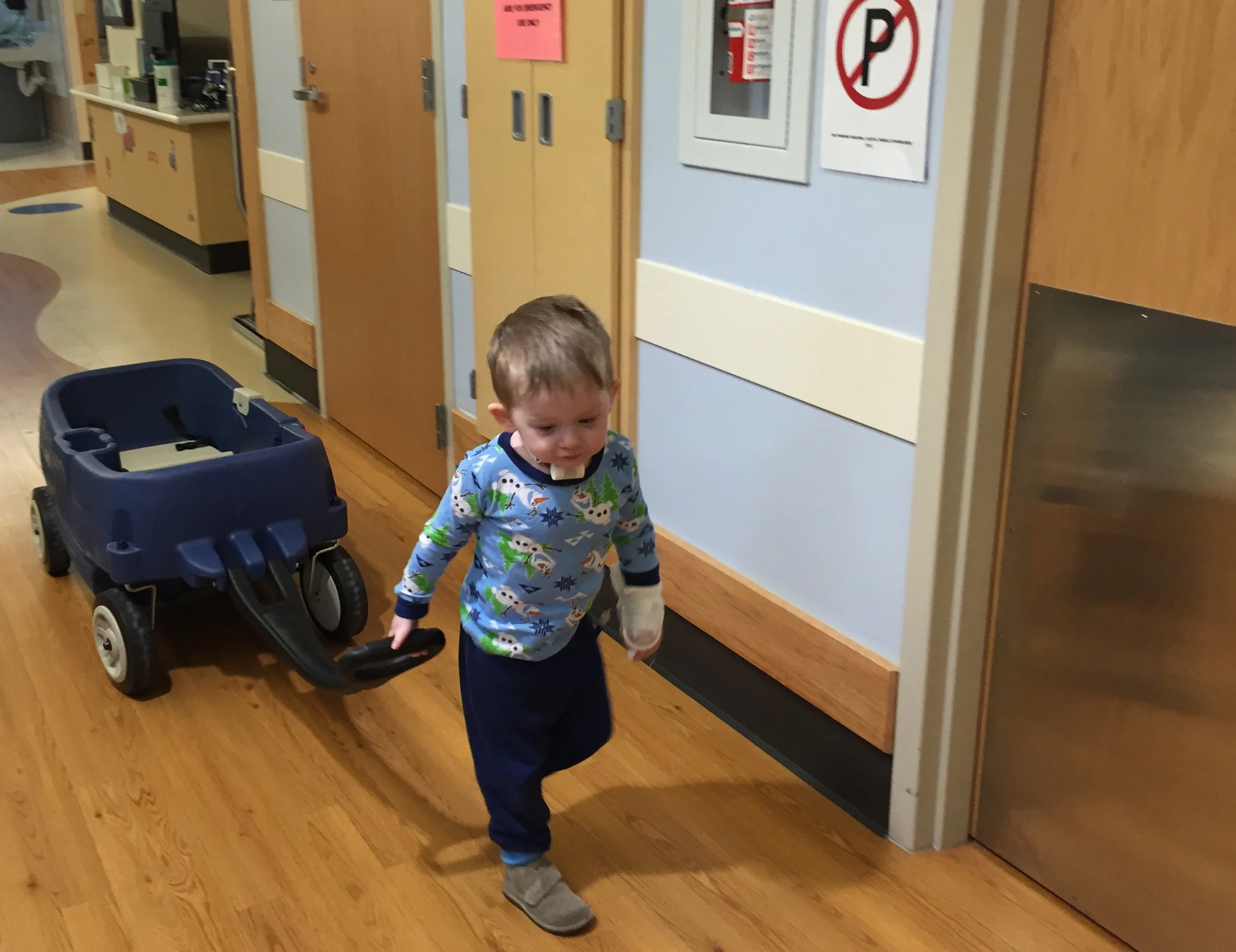 Nathaniel has improved by leaps and bounds since the third day post surgery. He's playing with trucks, working on language, and roaming the halls pushing and pulling a wagon. Opps! It is not so quiet around here anymore. We're even back to taking hospital selfies. (Boy, do I have a lot of hospital selfies with this kid.) Tomorrow morning early (6:30) the doctors will change his tracheostomy tube for the first time. If you happen to be a Saturday morning early riser - pray for us. Rich and I both need to be present to learn new care. We will see the incision and new stoma for the first time. We have been through many surgeries as parents; it never gets easy to see a fresh surgical wound on a small child. Afterwards Rich and I will each demonstrate our ability to care for the stoma and change his trach tube. If we do this tomorrow, Nathaniel will be discharge. The discharge is two days earlier than doctors told us to anticipate - a sign of how quickly he has recovered in the last couple days.