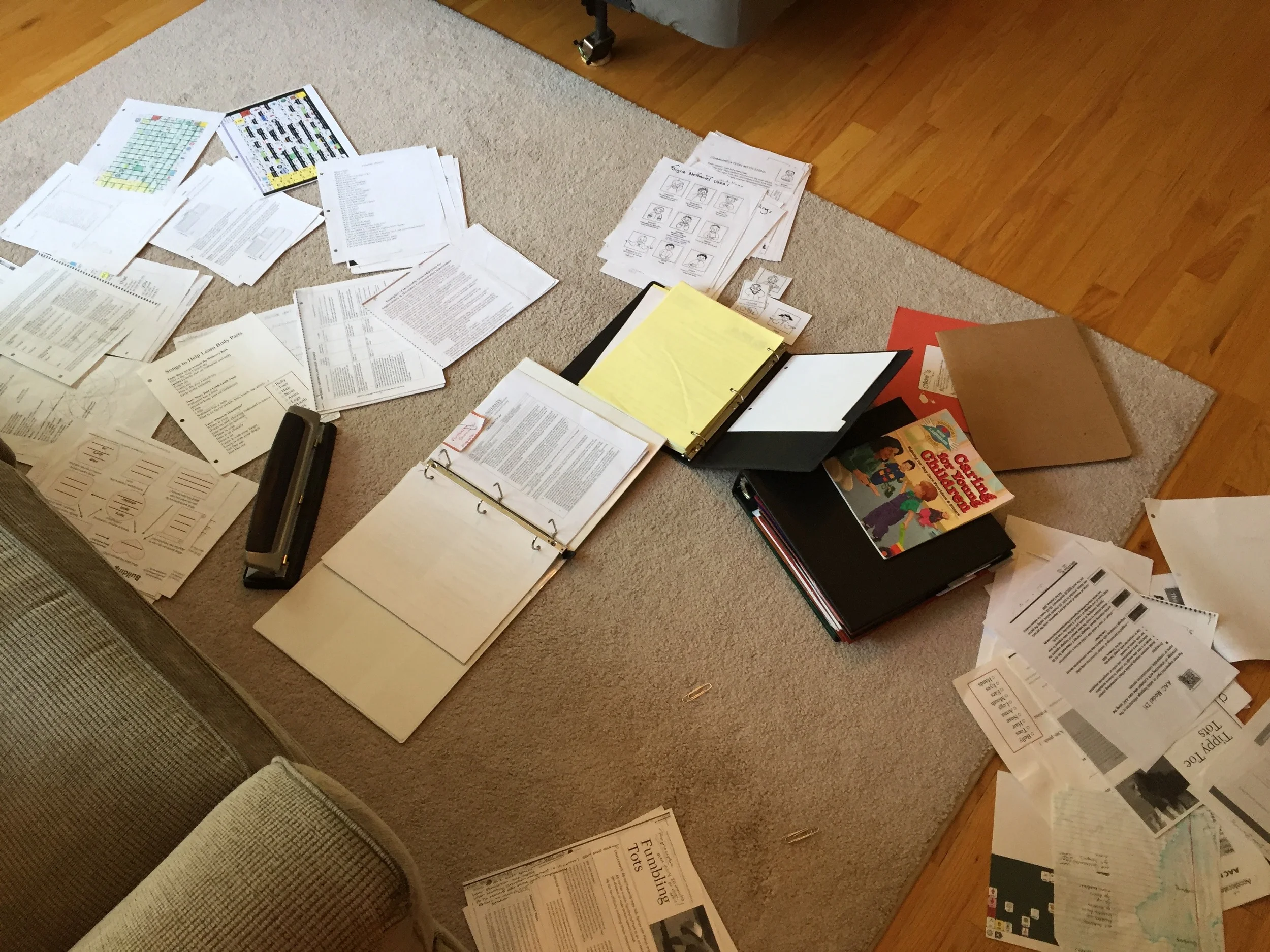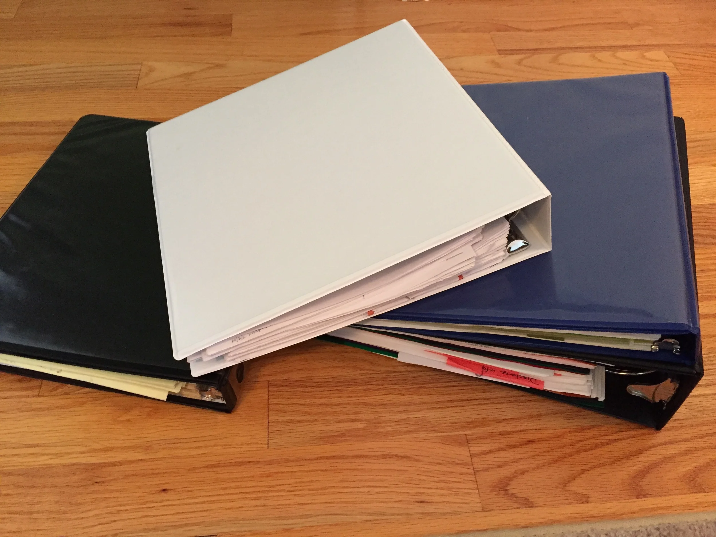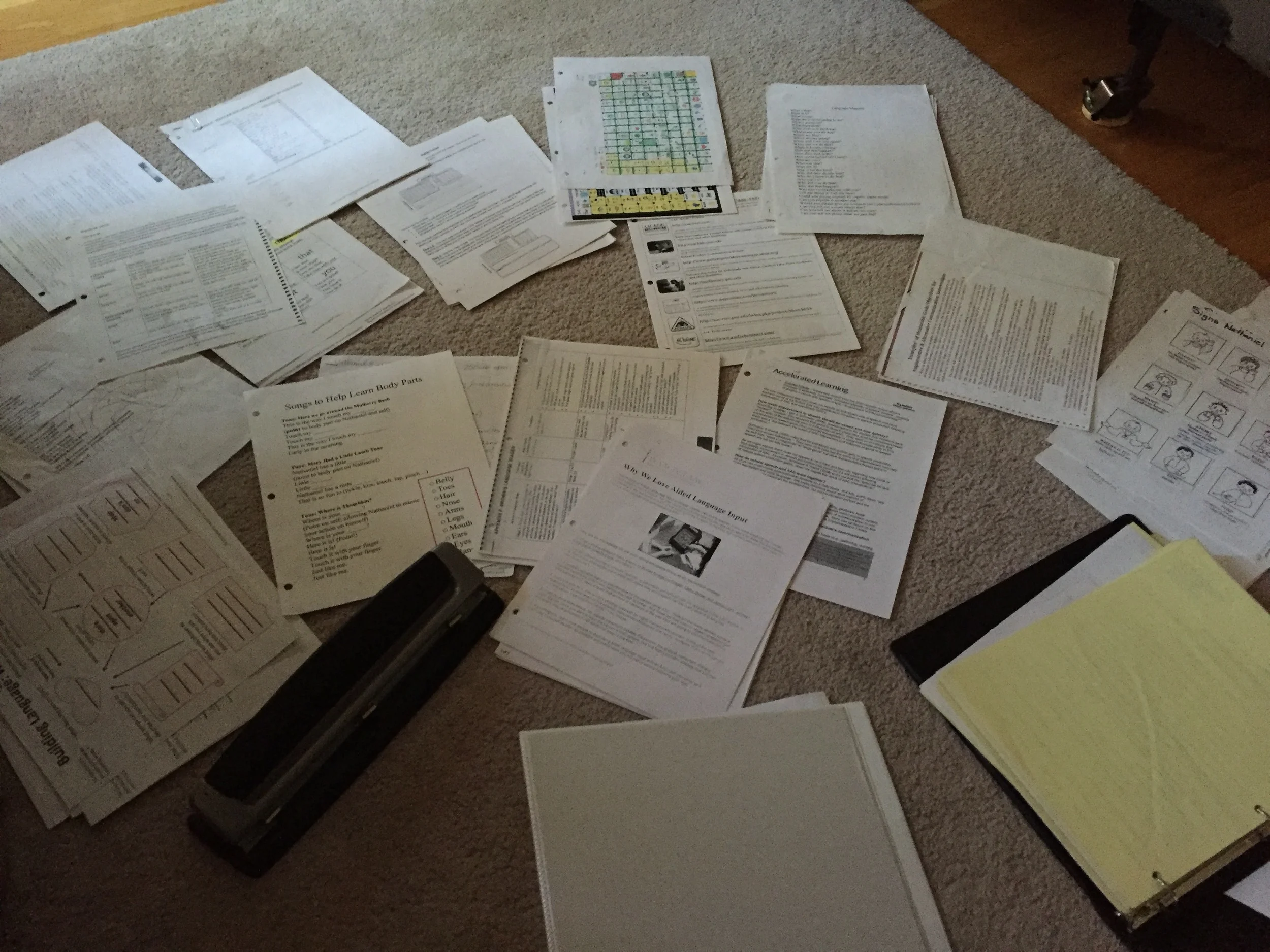 Rich spent today helping a young man from our Boy Scout troop with an Eagle Scout project, so I spent time focusing on our AAC journey. Nathaniel and I went to Target and bought a heavy duty binder, my fourth binder for All Things Nathaniel. Augmented Communication has overtaken and outgrown the THERAPY section of my main binder. The new one will hold all the scholarly articles, reports, word lists, printed web pages, screen shots, lists of goals, and other paperwork I have gathered pertaining to AAC. I sorted, stapled, hole punched, labeled, and stuffed the new binder while Nathaniel napped.